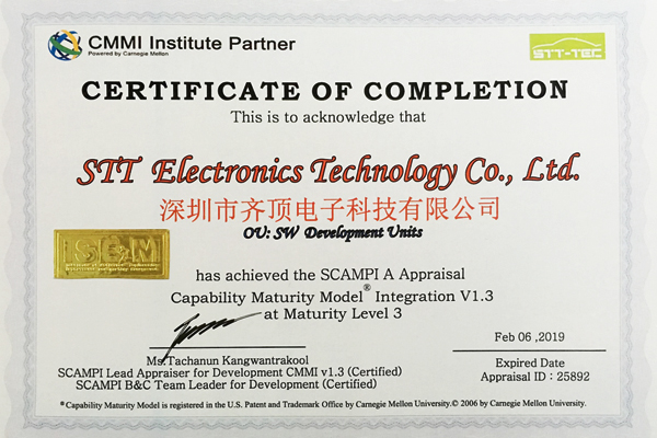 2016年1月份,在齊頂科技CMMI3級認證結(jié)果發(fā)布會上,主任評估師宣布:深圳市齊頂電子科技有限公司已經(jīng)達成了CMMI3級目標,成功通過CMMI3級認證。這是齊頂電子在軟件開發(fā)和管理標準方面發(fā)展的里程碑,標志著公司的軟件能力成熟度和項目管理水平與國際主流模式接軌。